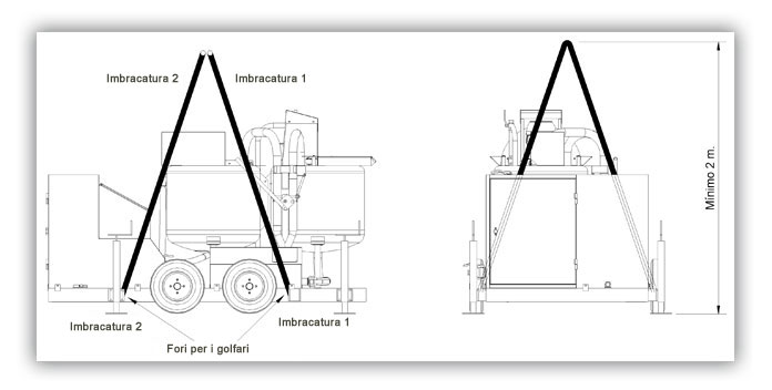 Il sollevamento della macchina deve essere effettuato tramite le imbracature in dotazione, di 4 metri di lunghezza, che devono essere inserite come illustrato nella figura.